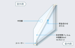 防犯ガラスは2枚のガラスの間に特殊な中間膜を挟んだ構造で、工具で叩いても貫通しにくく、侵入に時間がかかるため犯罪抑止効果が期待できます。