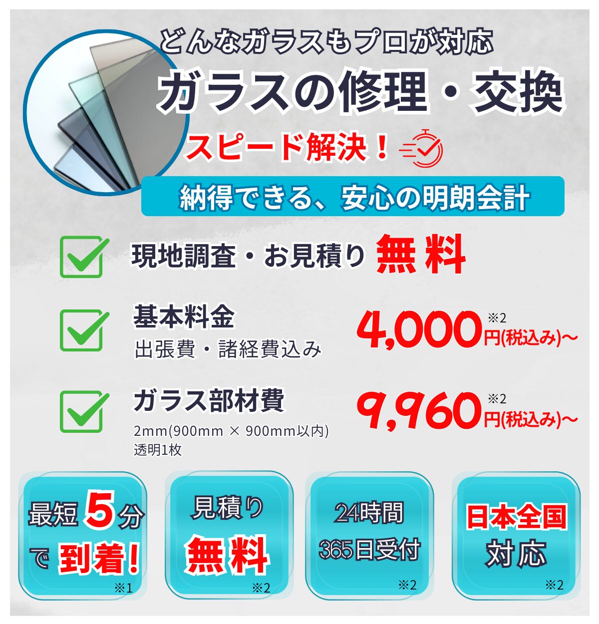 ガラス修理業者の中に料金が安すぎる、極端に高い、見積りを事前に出さないなど悪質業者がいることがあるため、依頼する場合は必ず複数の会社に見積もりを依頼してください。